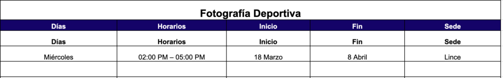 Apasionada por la fotografia deportiva, Andrea te brindará la informacion tanto tecnica como practica y te enseñará desde su experiencia el paso a paso que necesitas para iniciarte en este mundo del deporte.