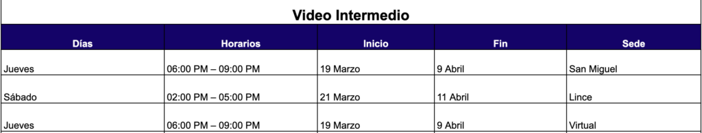 Cada curso consta de 08 clases durante todo un mes. Según la modalidad que escojas podrás asistir de forma presencial o conectarte de manera remota.